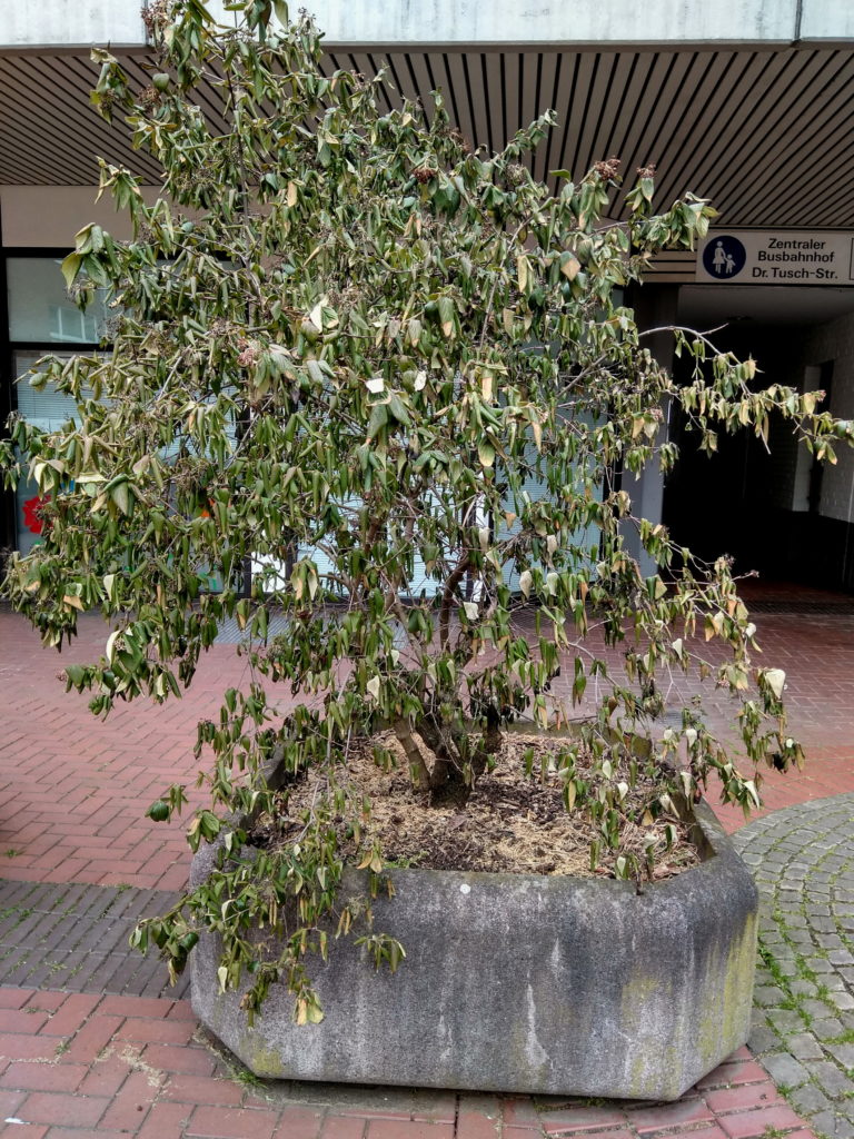 Während jetzt im Frühjahr überall die Bäume wieder ihr grünes Blätterkleid tragen, vertrocknet das innerstädtische Grün in den unansehnlichen Blumenkübeln weiter vor sich hin (siehe Foto).Geht es nach der Verwaltung, dann soll das auch auf unabsehbare Zeit so bleiben.